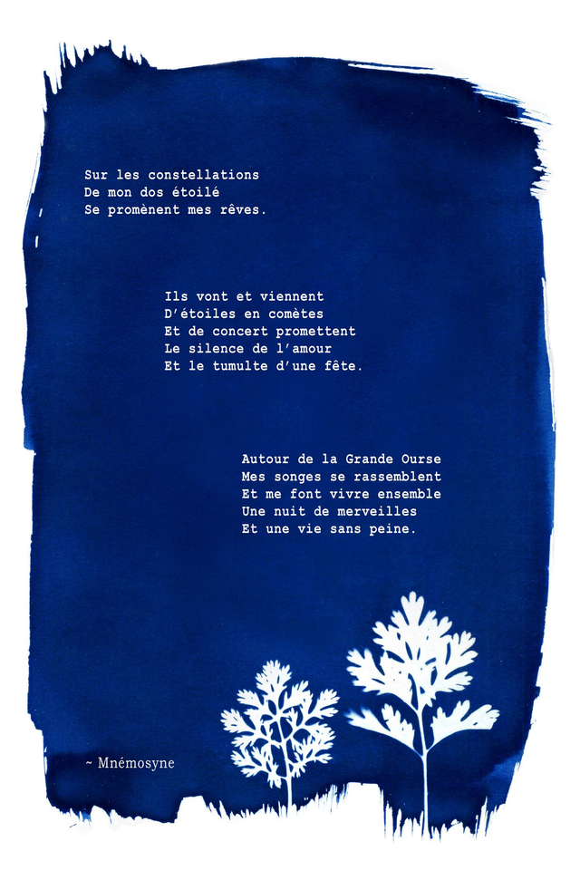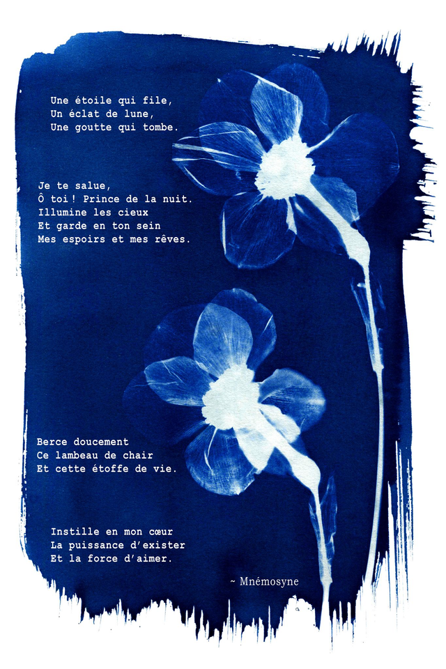 Cyanotypes et poèmes de l'artiste, mis en page par informatique et imprimés sur papier cartonné par une imprimerie professionnelle. Fourni avec une enveloppe blanche ou dorée.