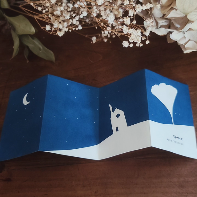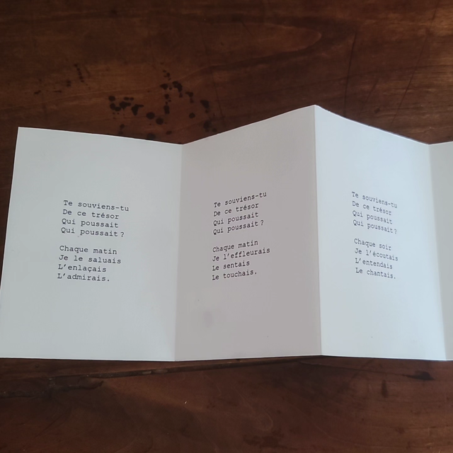 Trésor est un livre d'artiste qui fait partie de la collection des Leporellos poétique (livres accordéon) d'un feuillet, entièrement faits main, limités à 30 exemplaires et numérotés. Il mesure environ 5x10 cm plié, soit 30x10cm déplié.